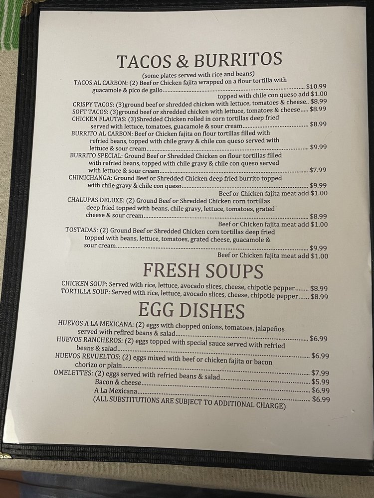 () Crispy beef taco, () beef tostada, () chile con queso puff, and () cheese enchilada topped with chile gravy.